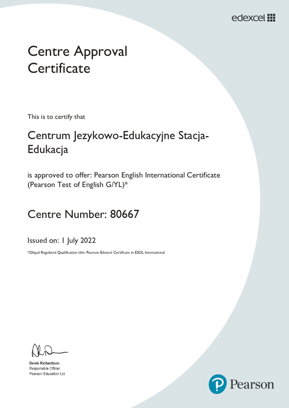 potwierdzający otrzymanie statusu akredytowanego międzynarodowego Centrum Egzaminacyjnego PEIC (Pearson English International Certificate) jedynego w okolicy.